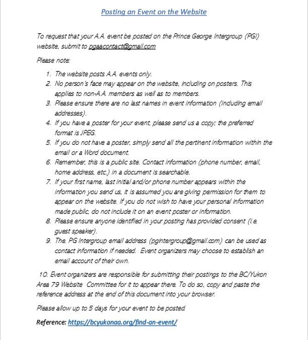 Want your A.A. event posted on this website? Email your requests to the Online Access Committee Chair at pgaacontact@gmail.com.